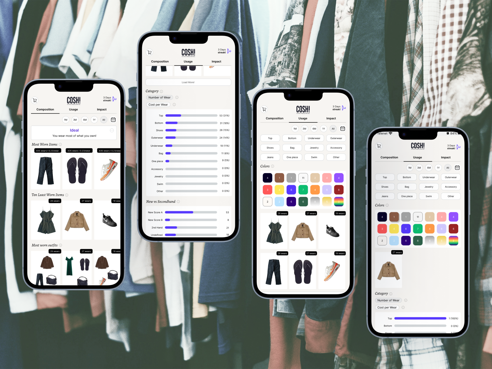 To ensure consistency, I began by studying existing materials and aligning my designs with the COSH! branding guidelines. I worked closely with the developer and product manager throughout the process.The first project involved designing a completely new section within the app called "Stats" — a space that consolidates various data-driven projects into a single, user-friendly feature. This section enables users to view up-to-date information about the products they are using.Below are some images showcasing the final app designs.