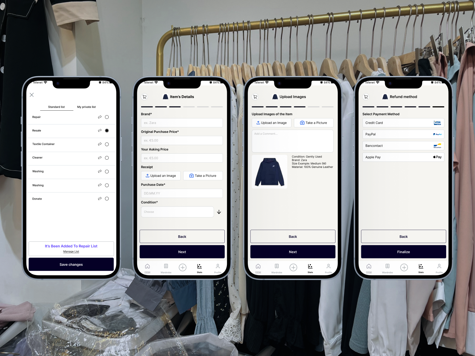 To add two new services to the COSH! application, I designed a Repair and Resale feature. These allow users to easily select an item and either request a repair or resell it to a selected partner shop in their local area.
